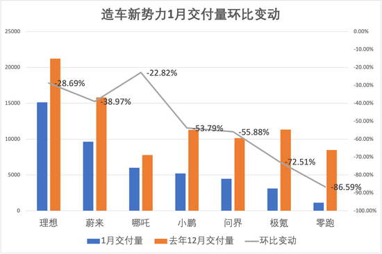 制图:澎湃新闻记者 吴遇利与去年12月份相比,上述几家造车新势力的交付量均出现不同程度下滑,其中哪吒汽车降幅最小,为22.82%。环比降幅最大的仍旧是零跑汽车,达到了86.59%。