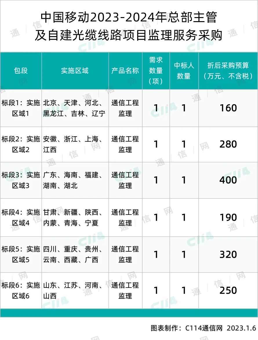 据此前中国移动发布的集采公告显示,本次主要采购2023年至2024年全国31省总部主管及自建光缆线路项目监理服务。项目折扣总预算为1600万元(不含税),项目共划分成6个标段,具体标段划分如下: