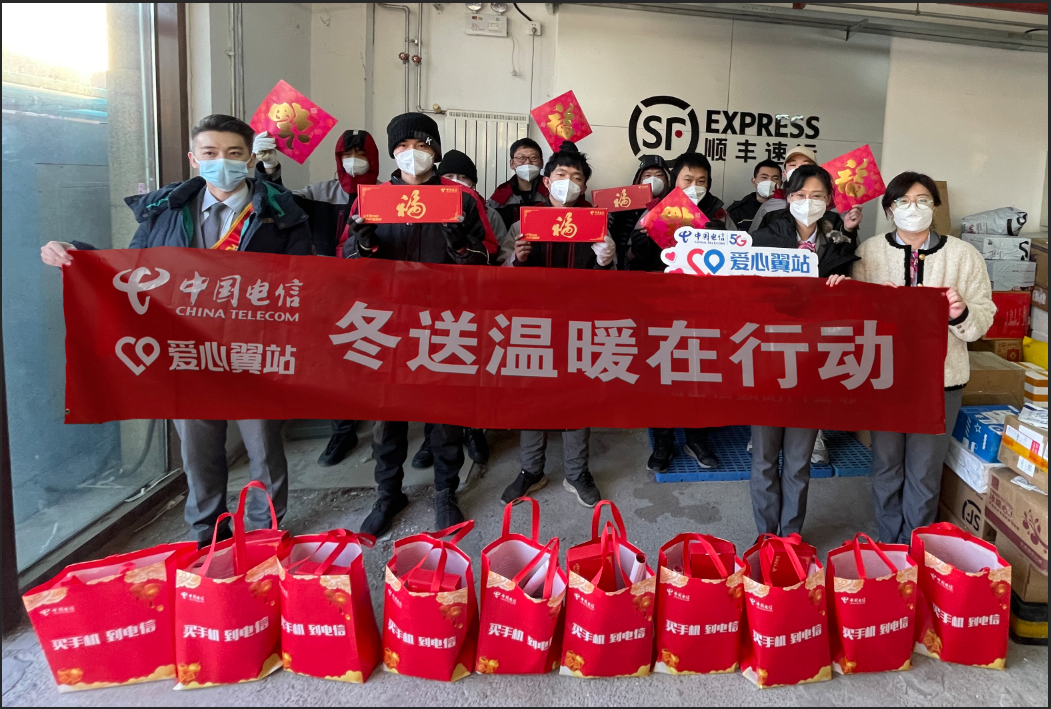 走出营业厅,北京电信“爱心翼站”工作人员走进社区,向老人、户外工作者分发春联、暖心礼盒等礼品,在寒冷的冬季传递独来自电信人的热情服务。