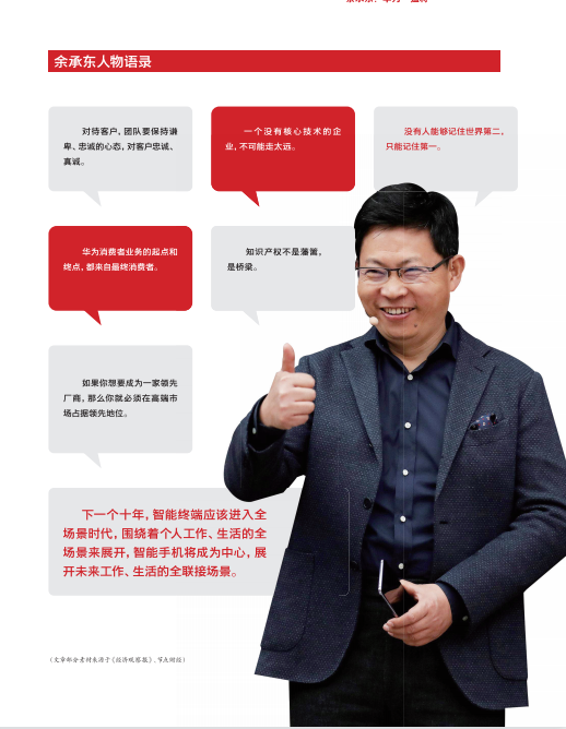 “我想我有傲气的一面,上学的时候就是这样,考第一名,遥遥领先,工作后也是如此,要做到超越所有对手,但我余承东不管怎样,绝对是真诚、实在的人,而且有什么说什么。”