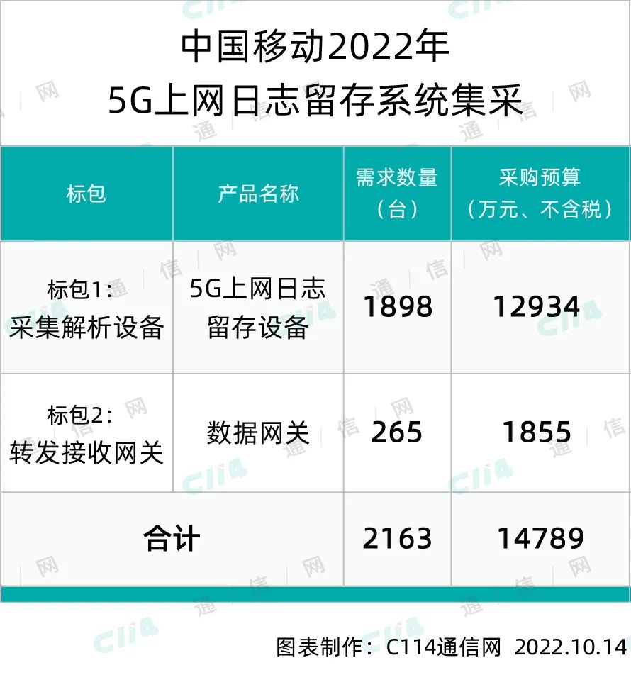 据此前中国移动发布的集采公告显示,本次5G上网日志留存系统招标内容包括:新增采集解析设备114T,新增转发接收网关2.97T。采购的产品包括:1898台5G上网日志留存设备、265台数据网关,项目总预算14789万元(不含税)。