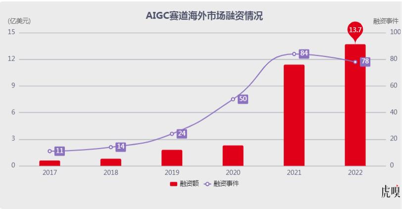 据第三方研究机构PitchBook的数据, 2022年海外投资者在AIGC赛道至少投入13.7亿美元,完成78笔交易,相当于前五年投资额之和。