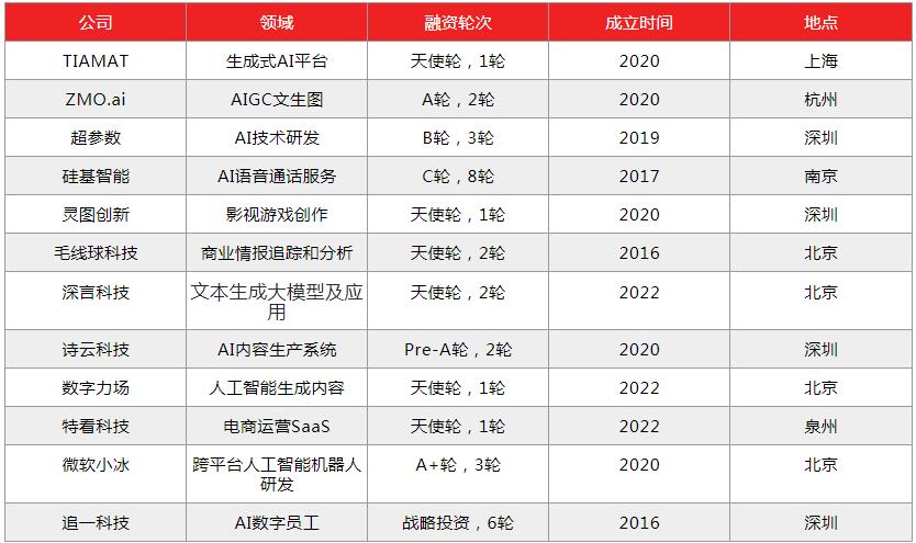国内部分初创AIGC公司及轮次(按公司名字排列)