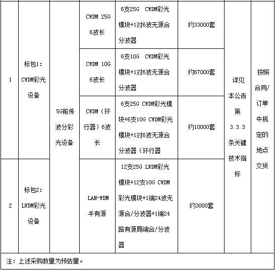 公告显示,本项目分为两个标包:标包1:CWDM彩光设备,标包2:LWDM彩光设备。预估采购规模为113000套。