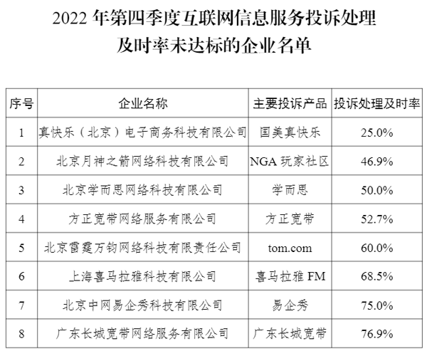 在互联网信息服务投诉方面,2022年第四季度,互联网信息服务投诉平台共收到互联网用户投诉33.58万件。其中,服务功能类投诉16.87万件,占比50.3%;客服渠道类投诉10.32万件,占比30.7%;个人信息保护类投诉3.40万件,占比10.1%;其他类投诉2.99万件,占比8.9%。在接入平台的互联网企业中,国美真快乐、NGA玩家社区等8家企业投诉处理及时率未达到95%的指标要求,世纪佳缘、知乎等投诉量增长较快,工业和信息化部已督促相关企业进一步改进服务,解决用户反映的问题。