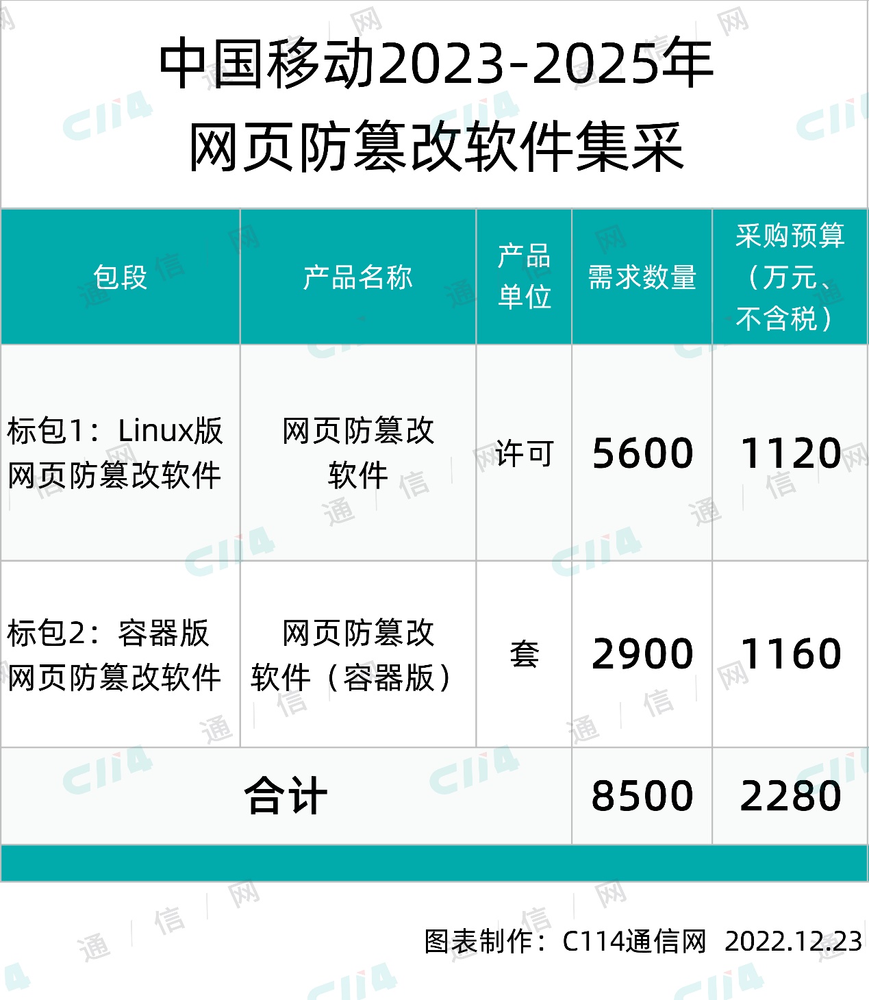 据此前中国移动发布的集采公告显示,本次共将采购网页防篡改软件8,500套,采购总预算2280万元(不含税)。项目采用混合招标,共划分为2个标包,每个标包的中标人数量均为1个,中标份额100%,具体标包划分及采购预算见下表: