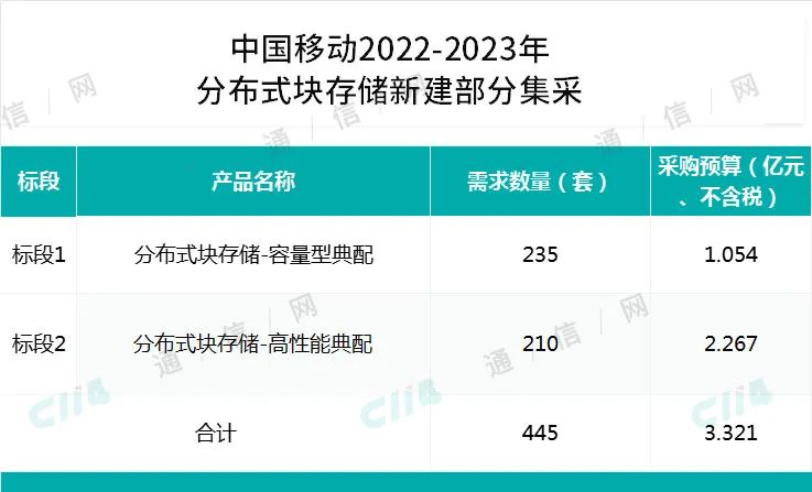 据此前中国移动发布的集采公告显示,本次采购的分布式块存储产品,预估总规模约445套,其中容量型典配235套;高性能典配210套。项目总预算3.321亿元(不含税)。项目采用混合招标,划分2个标包,具体标包划分及采购预算见下表: