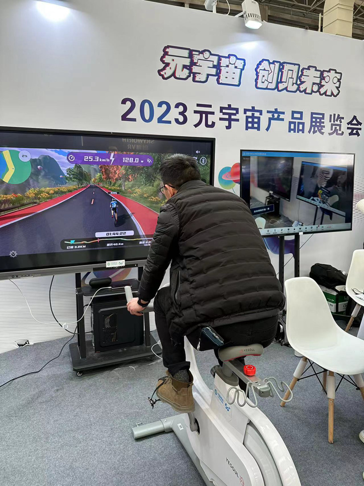 “数智骑行”是中国移动咪咕公司元宇宙数智化产品,将传统自行车和电子骑行台相结合,利用数字孪生、UNITY一比一建模和自行车速率以及阻力算法等顶尖技术,为广大骑行爱好者创造在元宇宙空间里的骑行体验。这条数字骑行赛道由咪咕公司组建的专业团队前往千岛湖实地拍摄测量,通过数字孪生技术实现一比一复刻,不仅真实还原了道路两旁的实际建筑物和自然环境,还将真实海拔高度、坡度起伏等高度数据还原到了数字赛道模型之中。骑行玩家通过骑行的阻力反馈能真实感受到上下坡过程中的阻力变化,通过电视大屏、手机/PAD小屏、AR/VR眼镜等各类屏幕呈现出的骑行空间,为“骑手”带来沉浸式的骑行体验。现场,数智骑行得到了诸多参观者的赞扬,“确实和在户外骑车差不多,爬坡感很真实。”