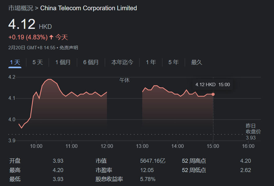 截至发稿,中国电信 A 股涨幅达到了 10.09%,目前市值 4707.42 亿元;而港股涨幅也接近 5%,目前市值 5647.16 亿港币。