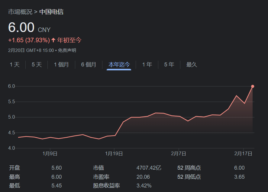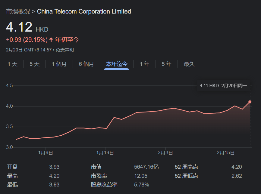 年初至今,中国电信港股已经涨近 30%,A 股涨幅也达到了 37.93%。
