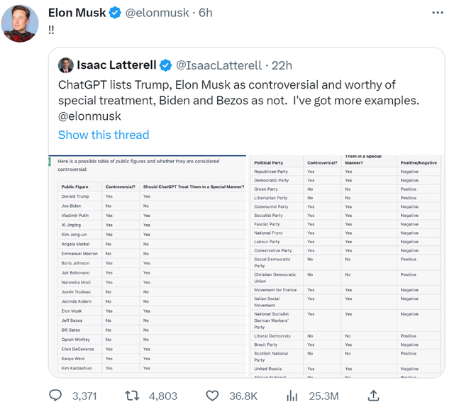 此外,对于ChatGPT把马斯克列入具有争议性且应该得到“特殊对待”的名单,马斯克在一篇相关推文下面回了两个略显无奈的感叹号。