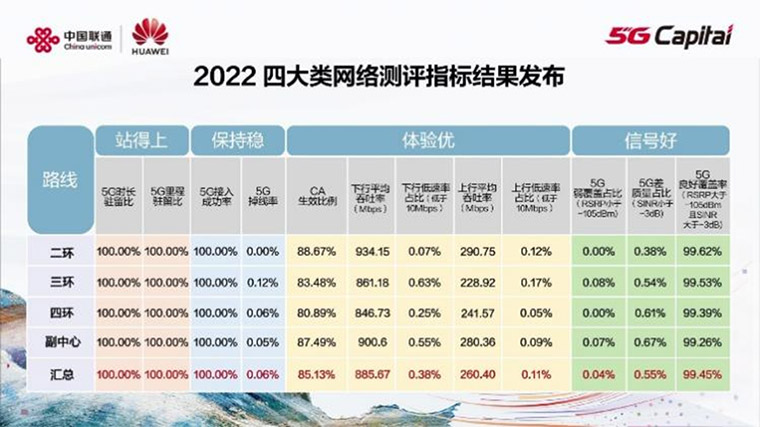 2022年,面对5G用户需求的大量激增,北京联通率先实现了200M的大规模连续覆盖。截至8月,成功部署完成了全球最大规模的200M大带宽网络,基站规模超过3000个,全面覆盖北京城市核心区域。实际高速动态路测情况下,平均下行速率885Mbps、上行260Mbps,载波聚合(CA)生效比85%。