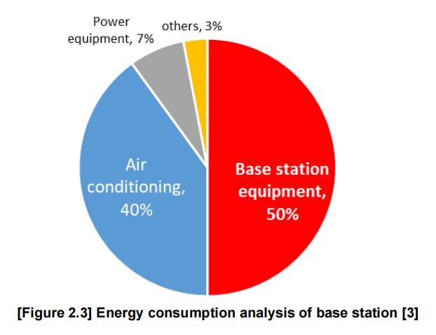 据SK电讯和NTT Docomo称,在RAN本身中,基站设备占总能耗的50%,其次是空调,能耗占比为40%。这份白皮书指出,5G设备通常能耗更高,这是因为其发射器数量增加了,比如Massive MIMO(使用的发射器是LTE的8-16倍),而且5G的信道带宽增加了,是LTE的5-10倍。