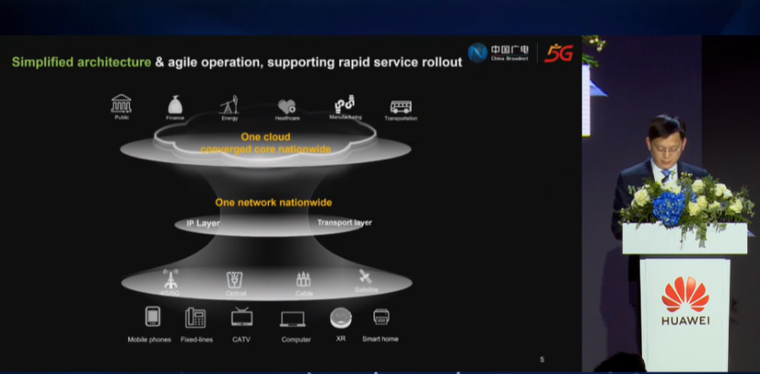 为了快速对外推出广电5G业务,中国广电选用了极简架构建网模式,其传输网是基于现有的国家广播电视传输骨干网而升级的架构,构建了低时延、高可靠及低碳的网络基础设施,通过在全国的云网融合方案实现了4G/5G业务融合的核心部署,实现了对具体业务的统一集中运营体系,可满足不同业务对同一张网络的特定需求。