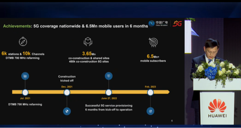 在2021年7月起,中国广电启动了全国范围内的700MHz地面无线数字电视频率迁移工作,仅用9个月的时间实现了对全国6000个电视台站以及10000个频道的频率重耕。在2021年12月,中国移动与中国广电的共建共享启动;到2022年6月27日,中国广电5G网络服务启动仪式在全国范围举行,广电“192”号段对外开放商用。