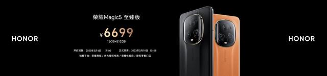 荣耀Magic5系列自全球发布会以来,在全球范围内获得了一致好评。在巴塞罗那MWC大会上,荣耀共斩获42个海外媒体奖项,荣耀Magic5系列独揽其中的18个。此次国内发布会,荣耀Magic系列更是毫无保留,根植于强大的技术研发实力,用科技创新实现手机行业的多个“第一”,在续航、通信、影像、显示、性能等多维度全面技术爆发,树立起2023年高端旗舰手机的新标尺。荣耀Magic5售价 3999元起、荣耀Magic5 Pro售价 5199元起、荣耀Magic5 至臻版售价6699元起,将于3月10日起在荣耀商城、各大授权平台、荣耀体验店、授权零售门店正式开售。