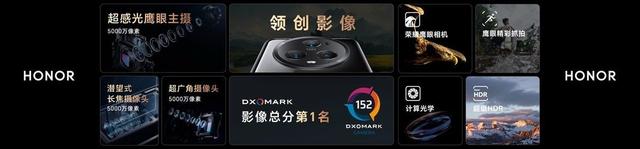 影像方面,基于HONOR Image Engine影像引擎的持续进化,实现了硬件规格、拍照速度和影像画质的全面革新进步。创新实现鹰眼精彩抓拍功能,轻松解决消费者抓拍场景的拖影、错过精彩瞬间的痛点,并且基于AI技术自动捕捉,可以轻松拍摄诸如舞蹈演员飞扬裙摆、极限滑雪最高点等稍纵即逝的时刻。全新升级的AI人像引擎2.0和在全链路高速HDR图像技术,解决消费者在复杂环境比如在夜晚、HDR、逆光或者复杂的光影出片率不高的痛点。荣耀Magic5 Pro也凭借其强大的影像实力以总分152分的成绩,再次荣登DXOMARK影像榜首。