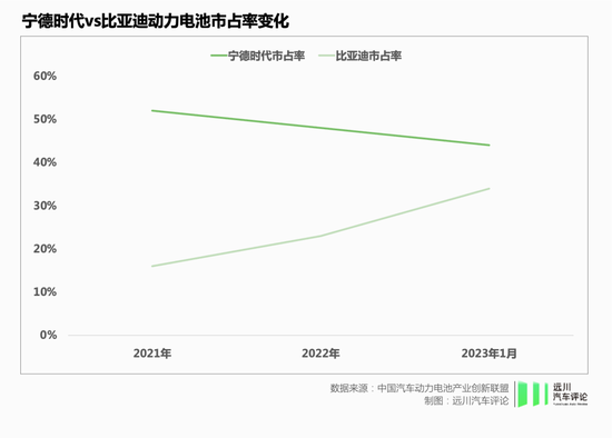 但从去年开始,宁德时代的市占率受到挑战。2022年,宁德时代国内市占率48%,近一半的市场份额虽仍有统治力,但对比前一年已经下滑了4个百分点,而在今年1月,宁德时代的市占率进一步下滑至44%。