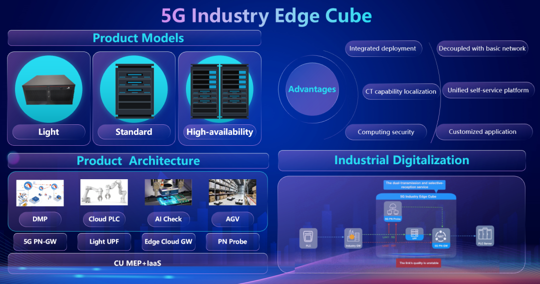 五是工业应用预植入,场景赋能:产品聚合联通内外部5G应用生态能力,预植工业DMP、云化PLC、AI质检、智能AGV调度等典型工业边缘应用,提供“网边端业”一体化服务支撑。