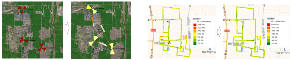 传统8TR方案和广角MetaAAU方案覆盖图(左)和测试结果(右)