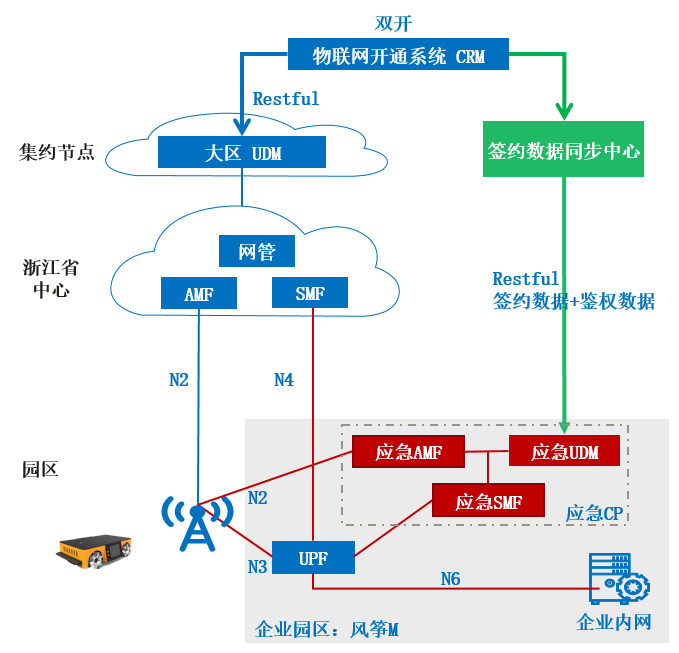 5G定制网风筝高可靠解决方案基于运营商5G网络公网专用,通过中心与边缘容灾协同,稳若磐石,敏如风筝。在园区入驻专网与中心网络失联时,能够自动切换到专网应急容灾控制面,大大提高了5G专网的可靠性,保障了企业生产系统的高可用性。同时中国电信对风筝M的数据同步方案进行了创新,通过CRM双发的方式,确保了大网UDM及园区应急UDM数据的同步性。