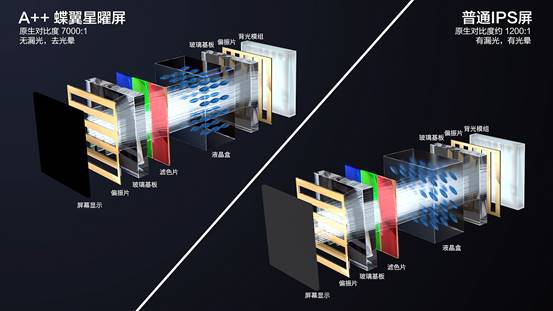在关键的屏幕显示上,TCL X11G 搭载了A++蝶翼星曜屏,它和Mini LED显示技术是绝配,采用纳米级仿生科技,结构形似蝶翼状,能够精准控制通过液晶层的光线,实现5倍对比度的提升;同时增加了一层抗环境光的超低反射率膜,能够有效降低环境光线对画面显示的干扰,让画面更通透,细节更清晰。