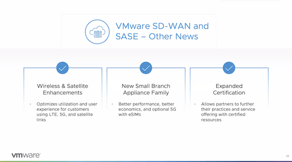 SD-WAN解决方案还针对连接能力进行了增强,能够让用户使用LTE、5G和卫星连接过程当中的用户体验大幅提升。VMware还推出了针对小型分支机构一体机的产品组合,具备优秀的性能与更好的经济效率,并且可以选择以ECM的方式连接5G。
