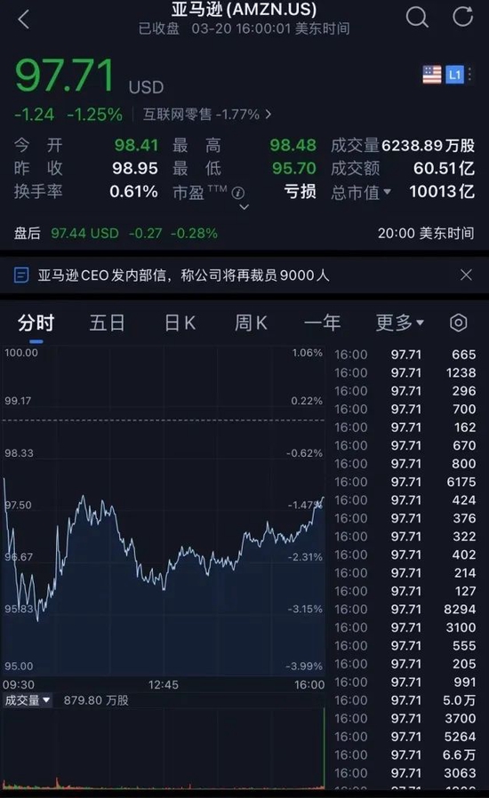 截至美东时间3月20日收盘,亚马逊股价为97.71美元,下跌1.25%,总市值为10013亿美元。
