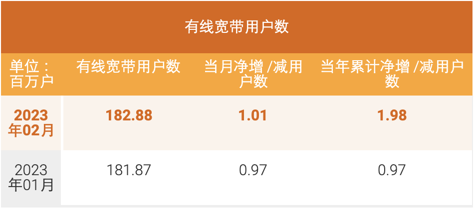 有线宽带业务方面,当月中国电信有线宽带用户数净增101万户,有线宽带累计用户数1.8288亿户。固定电话业务方面,当月中国电信固定电话用户数净减36万户,固定电话累计用户数1.0434亿户。