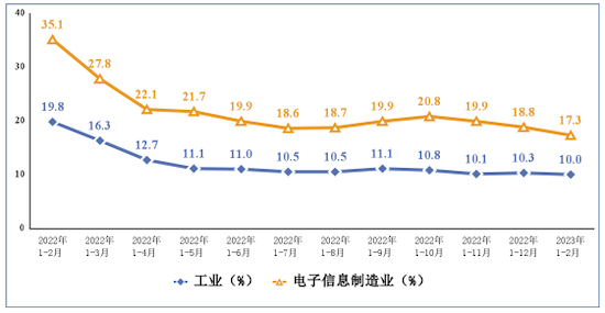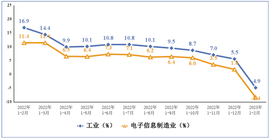 1―2月份,规模以上电子信息制造业增加值同比下降2.6%,增速分别比同期工业、高技术制造业低5个和3.1个百分点。