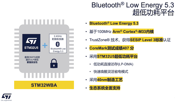 无线MCU在STM32家族中是一条新的产品线,本次新推出的STM32WBA系列产品,内核基于TrustZone Cortex-M33内核,主频最高100MHz,CoreMark测试成绩达407分,安全性上可通过SESIP Level3认证,采用40nm工艺。
