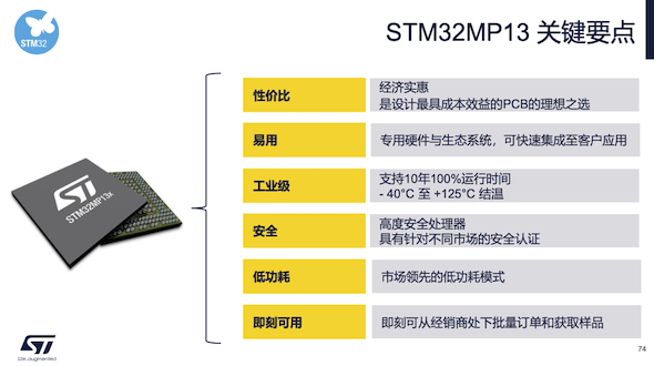 “这款是一款应用于工业级的通用 MPU 产品,兼具了强大的安全性,超低功耗的能力,它是一款具有超高性价比的MPU产品。其具有三大特点:易用、安全、低功耗。 ”意法半导体MDG中国区通用微控制器事业部微处理器产品市场经理霍笋表示。
