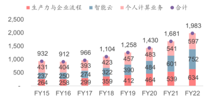 目前微软的业务分为三大板块:生产力与企业流程(Office、LinkedIn等);个人计算业务(Windows、Bing、游戏、平板等)和智能云(云计算平台、服务器系统等)。其中,智能云是近些年微软投入最多、发展最快的业务部门。
