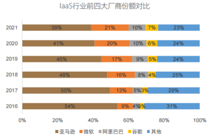 图3:IaaS行业前四大厂商份额对比,资料来源:彭博,IDC,Gartner,复星恒利
