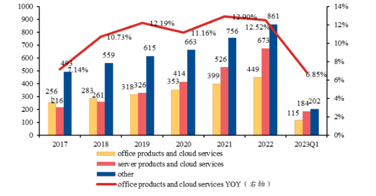 图4:微软Office产品及服务营收情况和增速,资料来源:微软财报,兴业证券