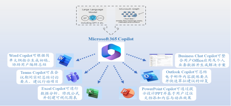 解放生产力,包括实时、自动总结会议要点,通过商务聊天从Microsoft365所有应用和数据中获取所需信息等;
