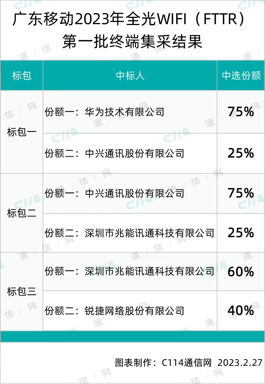 C114讯 4月19日消息(焦焦)自2023年以来,中国移动广东、上海、江苏、浙江4个省市公司陆续启动全光WiFi (FTTR) 产品公开集采。截止目前,4个省份移动公司均已公示了中标结果。