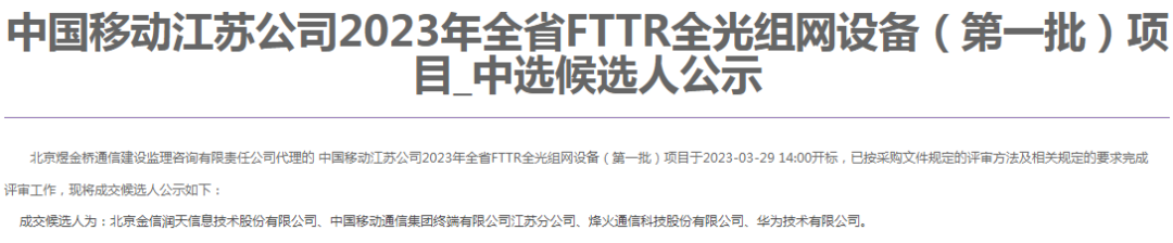 江苏移动2023年全省FTTR全光组网设备(第一批)竞争性谈判采购
