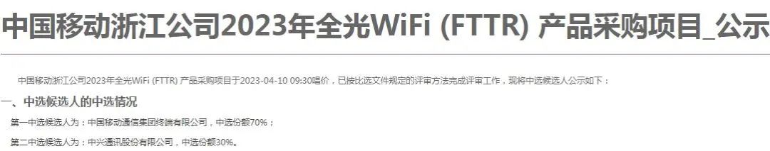 3月底,浙江移动启动2023年全光WiFi (FTTR) 产品公开采购,采购总量为29000套,其中包含光网关组件2.9万套、光路由组件4.5万套。项目共划分成1个采购包,中选2家,中选份额依次为70%、30%。
