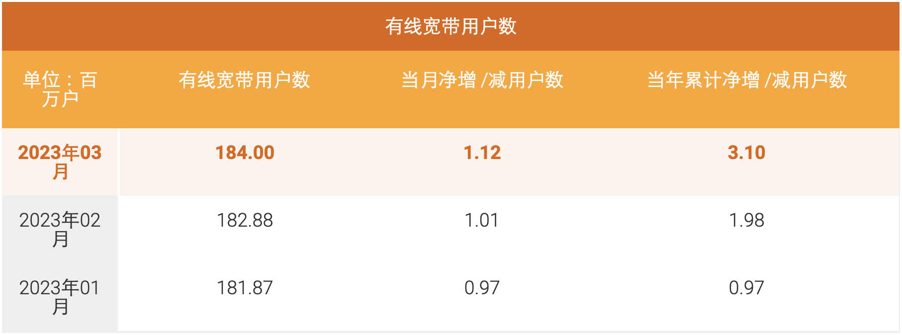 2023年首季度,中国电信有线宽带用户净增310万户,累计达到1.84亿户。