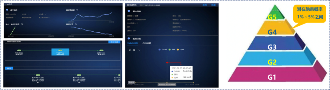 设计新型五级量化分类方案,细粒度量化评定光网传输质量潜在隐患风险概率,支持光网传输质量评估指标多维度可视化呈现,实现时序回放和关联预测功能,为自智网络L4/L5能力实现提供决策基础。