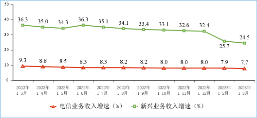 一季度通信业电信业务收入、总量同比分别增长7.7%和18%