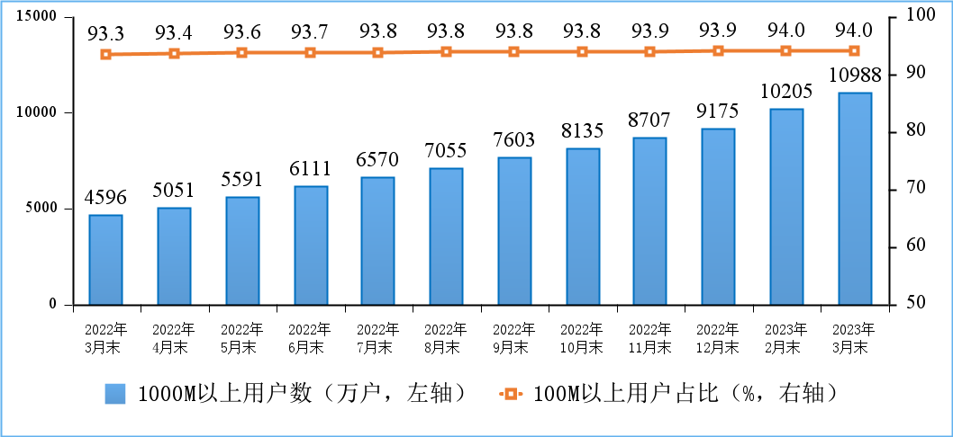 固定宽带接入用户稳步增加,千兆用户规模持续扩大。截至3月末,三家基础电信企业的固定互联网宽带接入用户总数达6.04亿户,比上年末净增1457万户。其中,100Mbps及以上接入速率的固定互联网宽带接入用户达5.68亿户,占总用户数的94%;1000Mbps及以上接入速率的固定互联网宽带接入用户达1.1亿户,占总用户数的18.2%,比上年末净增1813万户。