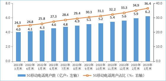 移动电话用户规模稳中有增,5G用户快速发展。截至3月末,三家基础电信企业的移动电话用户总数达17.05亿户,比上年末净增2161万户。其中,5G移动电话用户达6.2亿户,比上年末净增5927万户,占移动电话用户的36.4%,占比较上年末提高3.1个百分点。