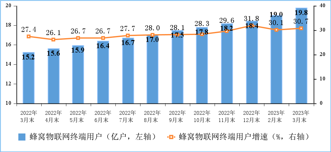 蜂窝物联网用户规模快速扩大,IPTV用户稳步增加。截至3月末,三家基础电信企业发展蜂窝物联网终端用户19.84亿户,比上年末净增1.39亿户,占移动网终端连接数(包括移动电话用户和蜂窝物联网终端用户)的比重达53.8%。IPTV(网络电视)总用户数达3.87亿户,比上年末净增665.2万户。