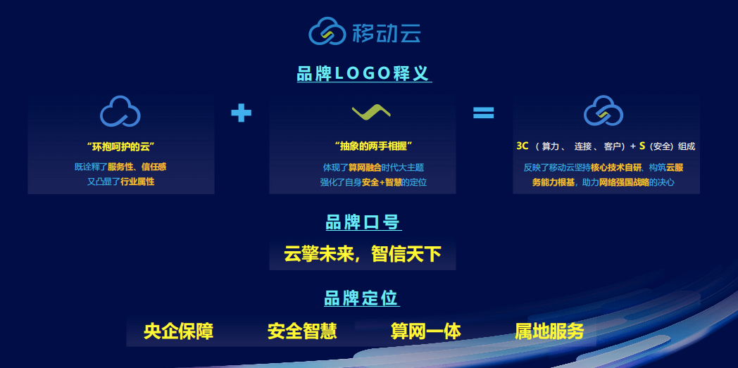 移动云全新品牌LOGO由两部分组成:外层为“环抱呵护的云”,既诠释了服务性、信任感又凸显了行业属性;内层为“抽象的两手相握”,体现了算网融合时代大主题,强化了移动云“安全+智慧”的定位。整体造型酷似“3C(算力、连接、客户)+S(安全)”,反映了移动云坚持核心技术自研、构筑云服务能力根基,助力网络强国战略的决心。