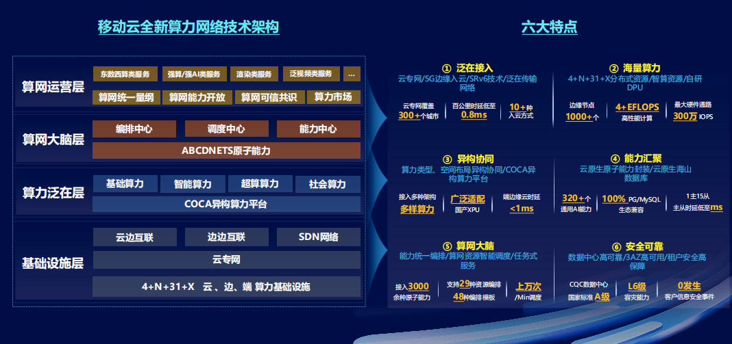 移动云四层技术架构打造全新技术内核3.0,向算力网络演进,具有六大特点:泛在接入、海量算力、异构协同、能力汇聚、算网大脑和安全可靠。