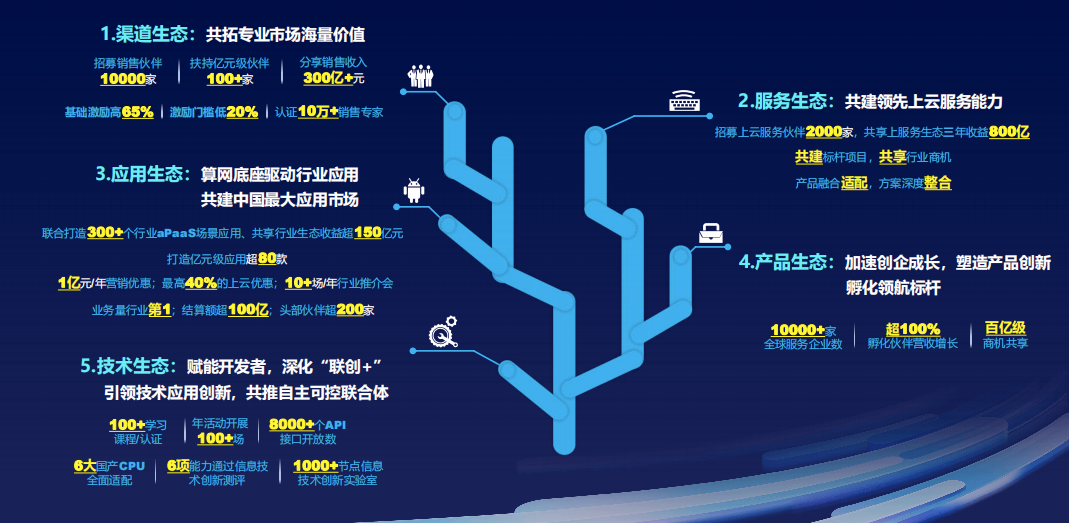 万象生态体系3.0包含五大计划:渠道生态计划,招募销售伙伴10000家,扶持亿元级伙伴100+家,分享销售收入300亿+元,共拓专业市场海量价值;服务生态计划,招募上云服务伙伴2000家,共享上云服务生态三年收益800亿,共建领先上云服务能力;应用生态计划,联合伙伴打造300+个行业aPaaS场景应用,共享行业生态收益超150亿元,共建中国最大云应用市场;产品生态计划,为助力创新企业成长,塑造产品创新孵化领航标杆,共享百亿商机;技术生态计划,赋能开发者,深化“联创+”,引领技术应用创新,共推自主可控联合体。