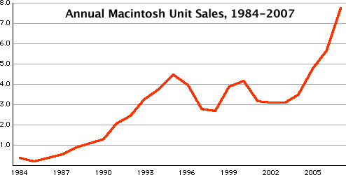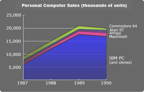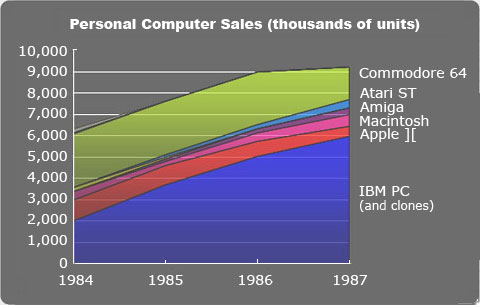 这也导致了苹果虽然有Macintosh这样划时代的产品诞生,也有较为丰富的生态,但与后起之秀IBM PC的竞争中,从未占得上风, AppleⅡ和Macintosh在80年代中期曾一度占据了25%左右的个人电脑市场份额,但随着时间的推移,苹果销量还在增多,占据的市场份额却在不断萎缩。
