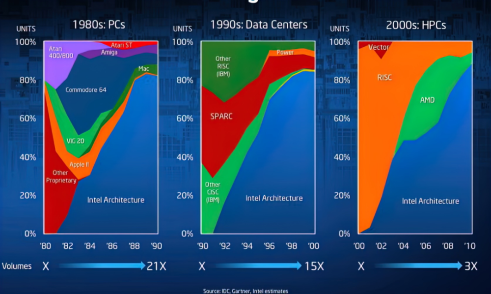 而更深层次的原因在于,虽然英特尔在个人电脑市场中叱咤风云,到90年代初,x86架构的CISC处理器已经占领了80%的个人电脑市场,但在工作站和数据中心市场中,以IBM为代表的RISC处理器占据了接近100%的份额,对此很容易会产生一种认知:高效高性能的RISC是将来时,过于复杂的CISC已经是过去时。